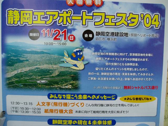 静岡空港の早期開港に向けて、空港建設地を会場に静岡エアポートフェスタ‘04が開催されます。空の玄関口となる静岡空港。盛りだくさんのイベントを用意しましたので、秋の一日、静岡空港の現在・未来を体感してみませんか。ご家族・お友達をお誘いの上、会場へお出かけ下さい。